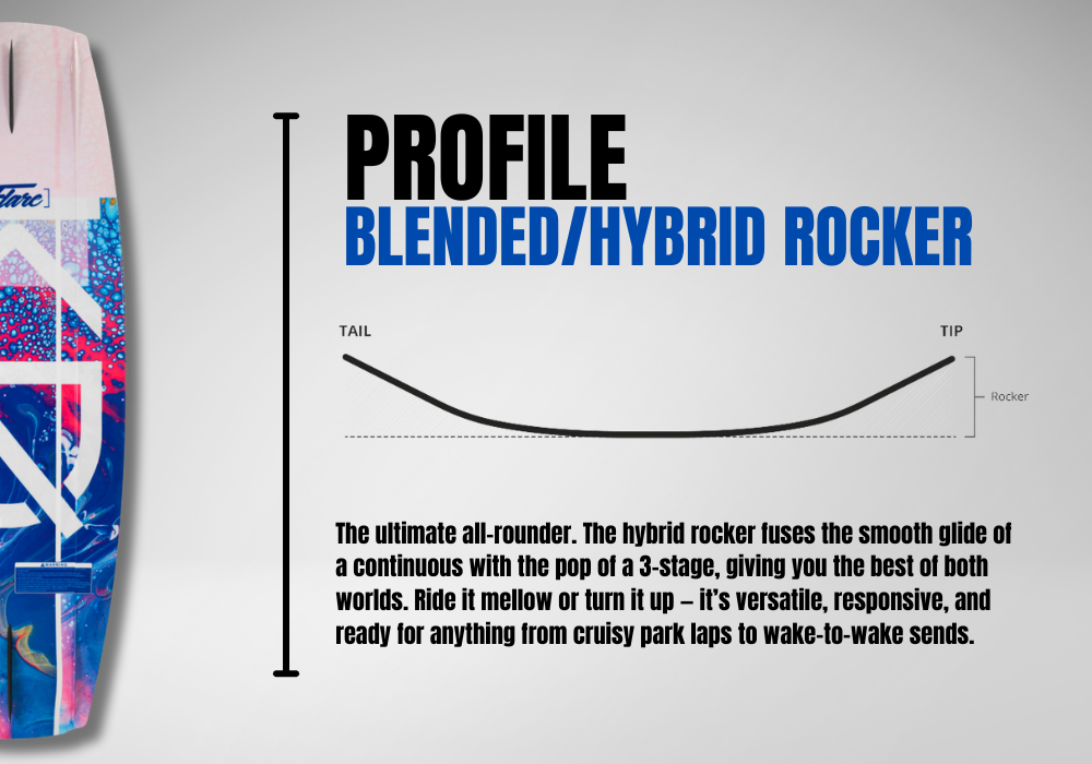 The Flare wakeboard is perfect for beginners wanting a fun, easy ride. Its unique shape offers smooth turns and steady pop off the wake, while wide edges help riders start easily and cruise at slower speeds. Designed for a confident, carefree ride, it’s the perfect choice to boost your wakeboarding skills with style and ease.
